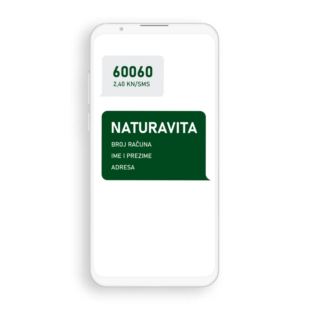 Poslati SMS sadržaja: NATURAVITA, broj računa, ime i prezime, ulica i kućni broj, poštanski broj i mjesto na broj 60060 (2,40 kn/SMS).